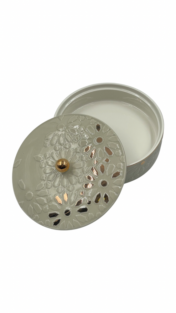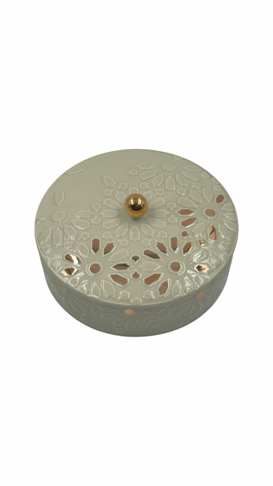 وعاء دائري بغطاء بنقش ذهبي براق بيج