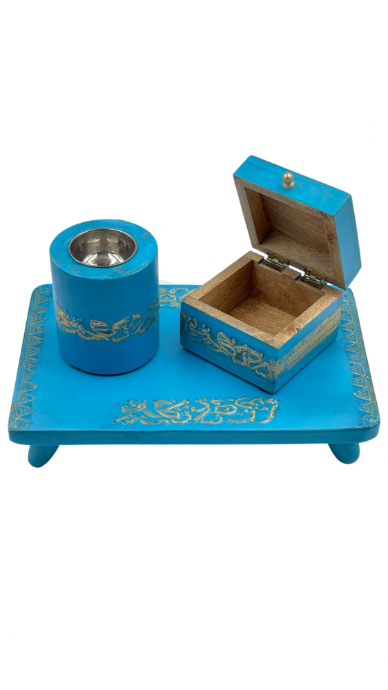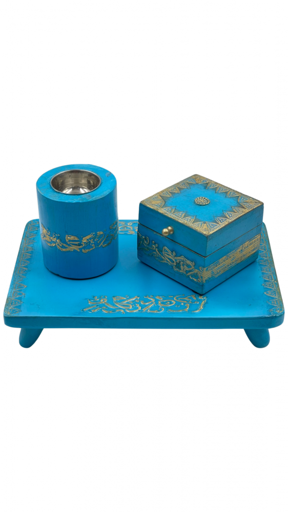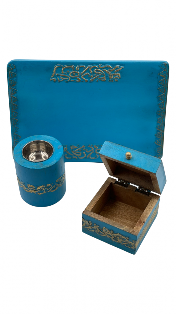 طقم خشبي فاخر من مبخره وصينيه و صندوق بنقش ذهبي جميلة لون ازرق