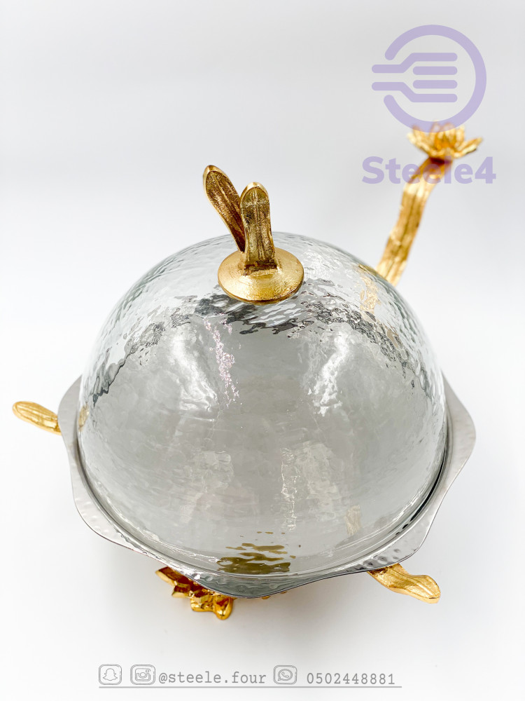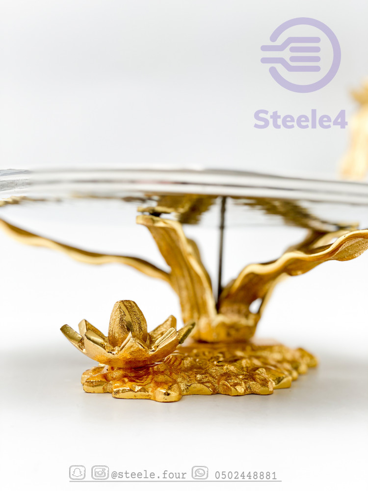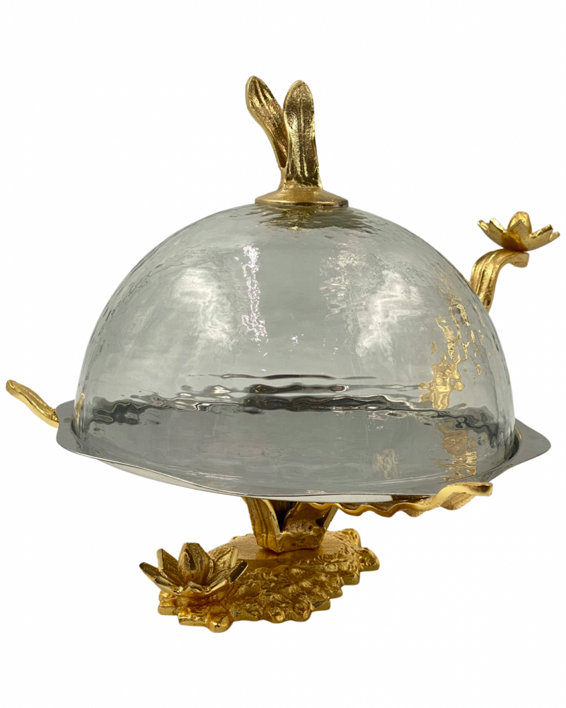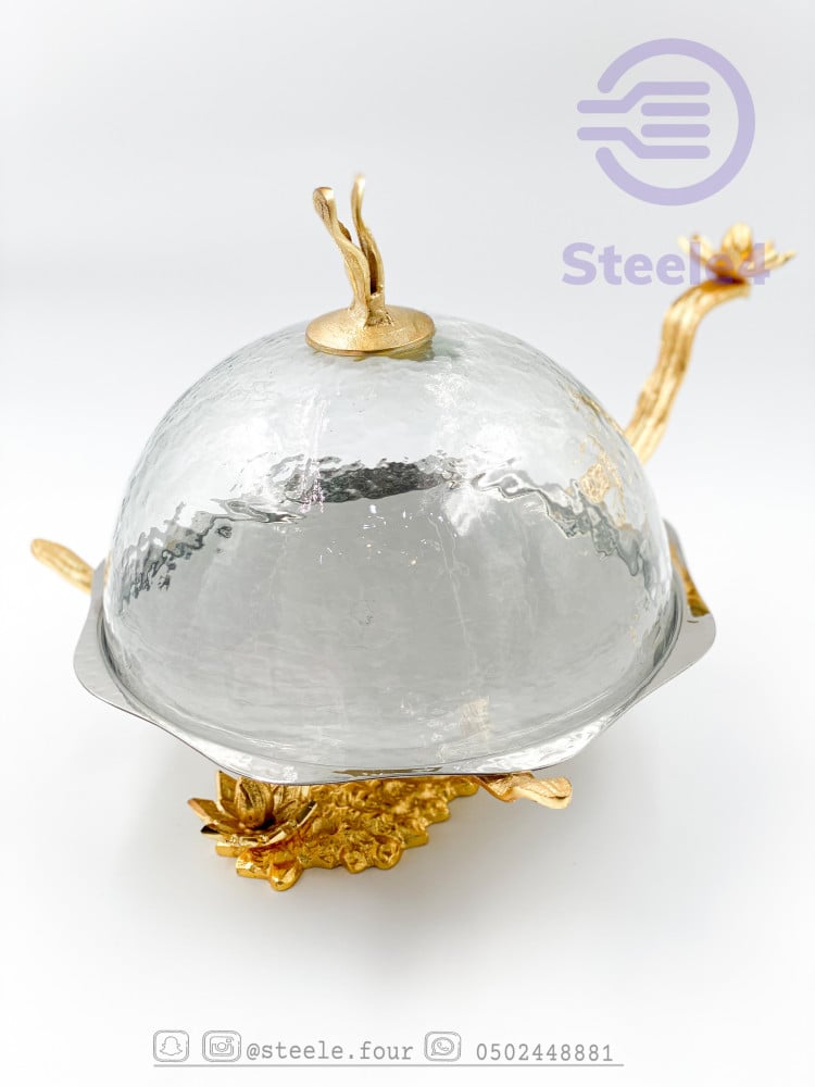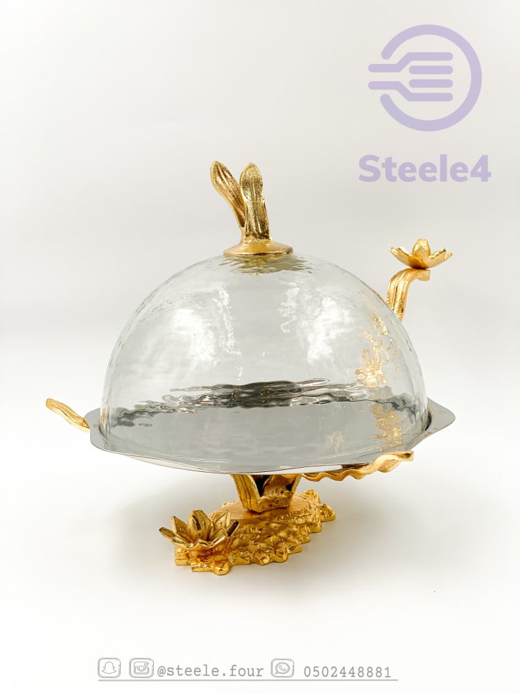 ستاند كعك و تقديم حلى انيق , مصنوع من الزجاج والاستيل والحجر الفاخر , تتميز بشكل لامثيل له بقاعده فريده ذهبيه وغطاء من الزجاج بمقبض ورده انيق