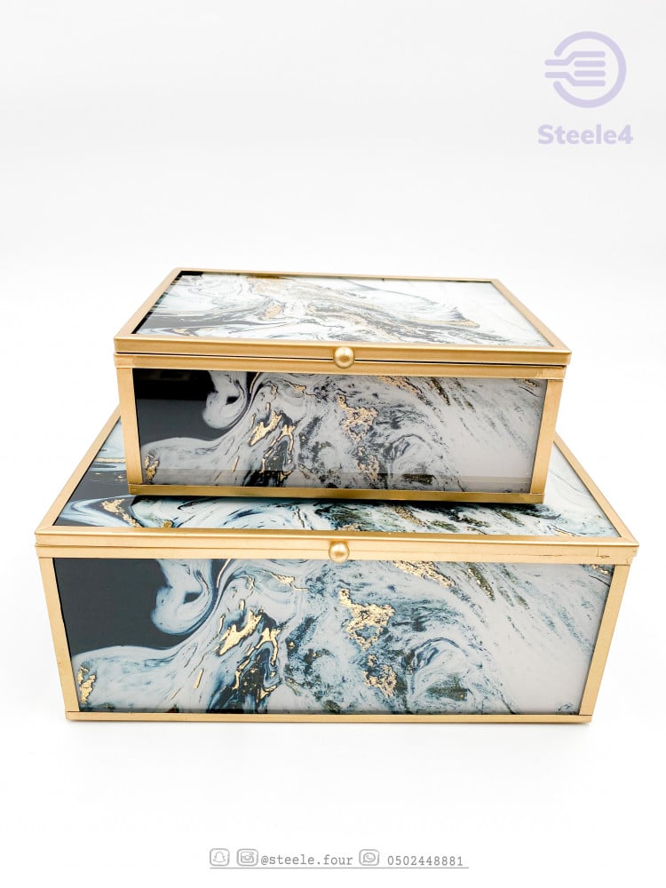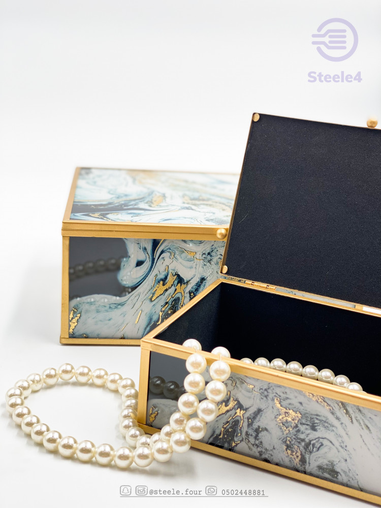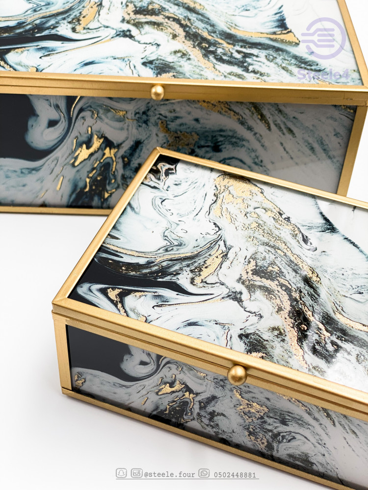 صندوق مصنوع من الزجاج بتدرجات الوان ساحره وحواف معدنيه ذهبيه براقه(اسود+ابيض)