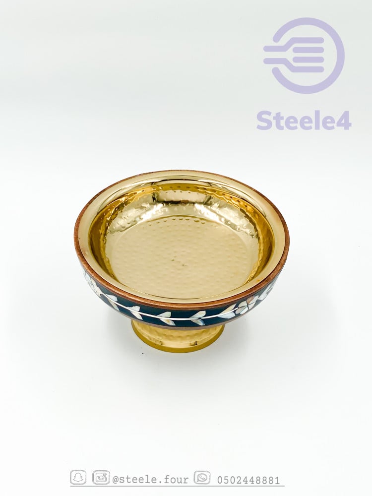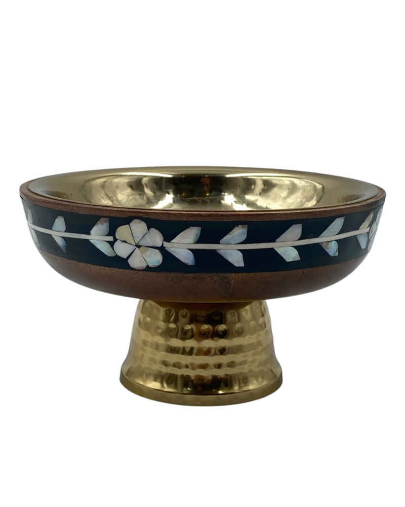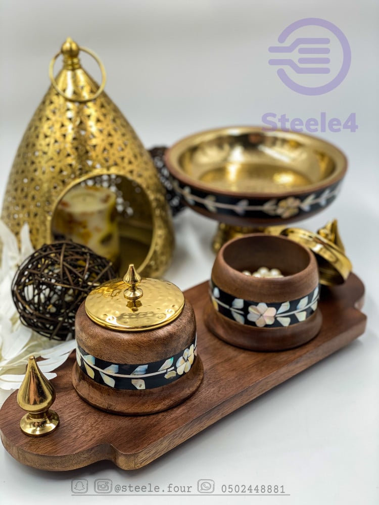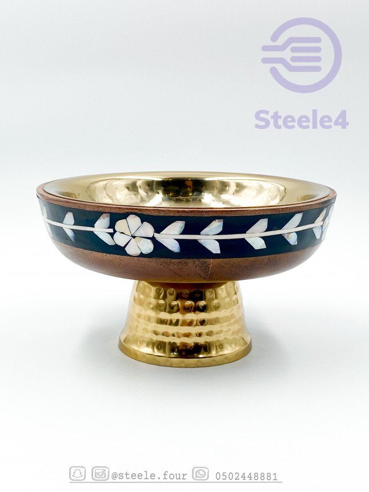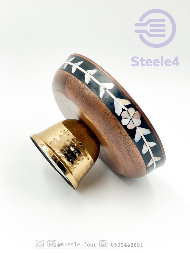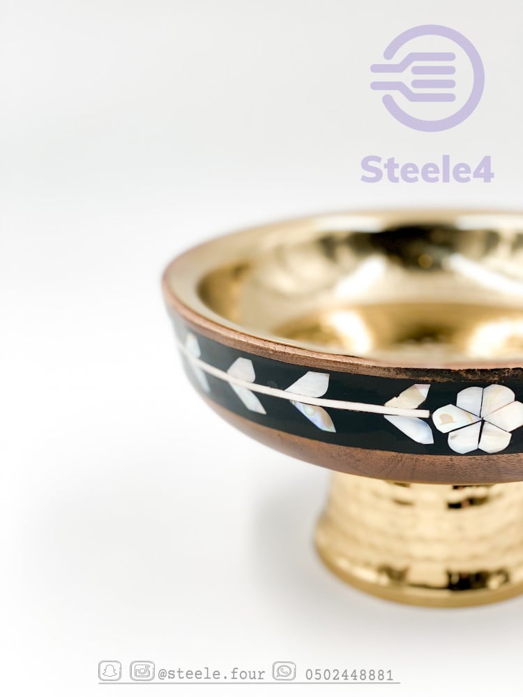 وعاء خشبي محاط بحلقه من الصدف الاسود , الوعاء مبطن بالاستيل الذهبي ليمنحه استدامه طويلة , ويتميز الوعاء بقاعدة من الاستيل الذهبي تضفي له ارتفاع جذاب وشكل مميز