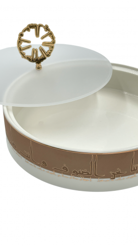 وعاء دائري وغطاء شفاف بعبارات ترحيبية بالخط العربي لون بني