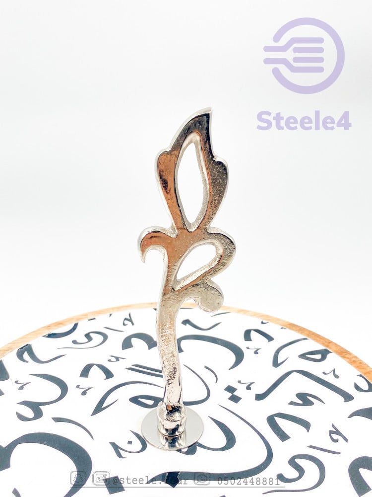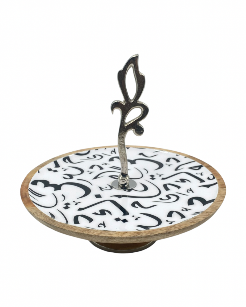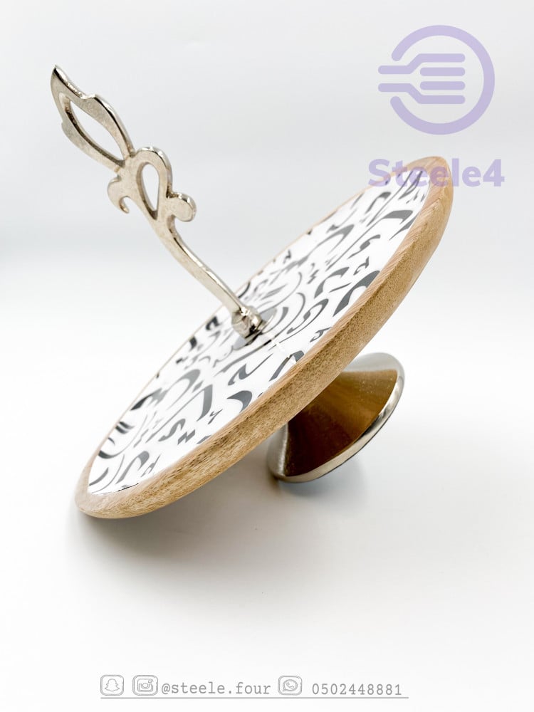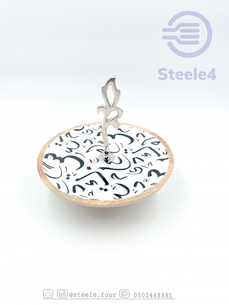وعاء خشبي دائري بممسك فضي وقاعده جذابه مبطن باللون الابيض وحرف عربيه باللون الاسود ,مطلي بماده امنه للطعام وسهل التنظيف