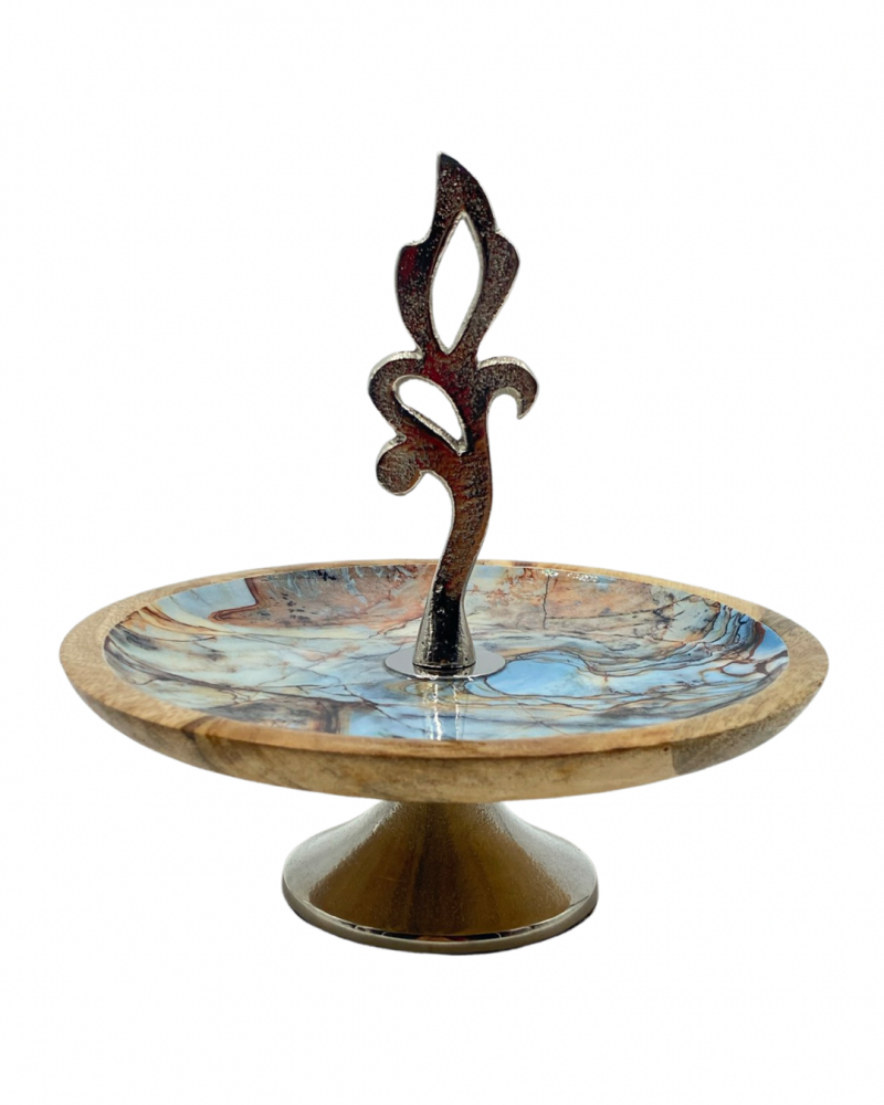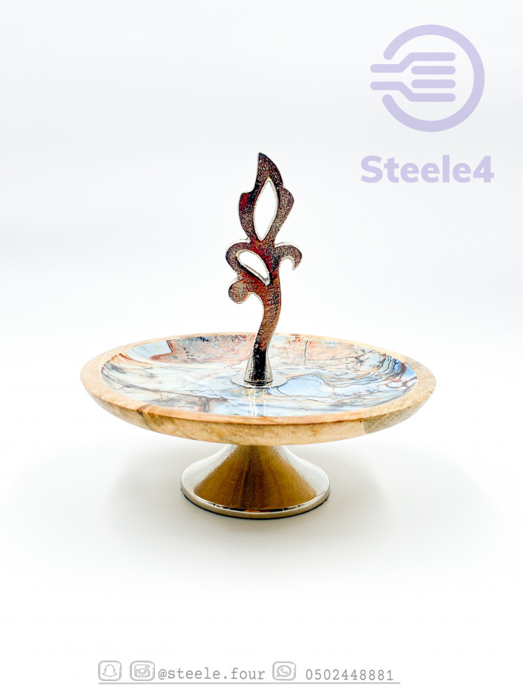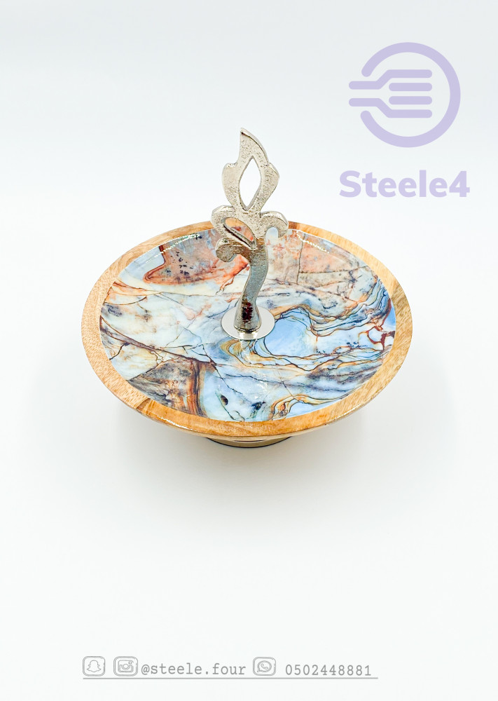 ستاند بحامل وقاعده فضيه وصحن مصنوع من الخشب المتين بترخيم ازرق مموج فريد وانيق , القاعده تضفي له ارتفاع يزيده جمالا