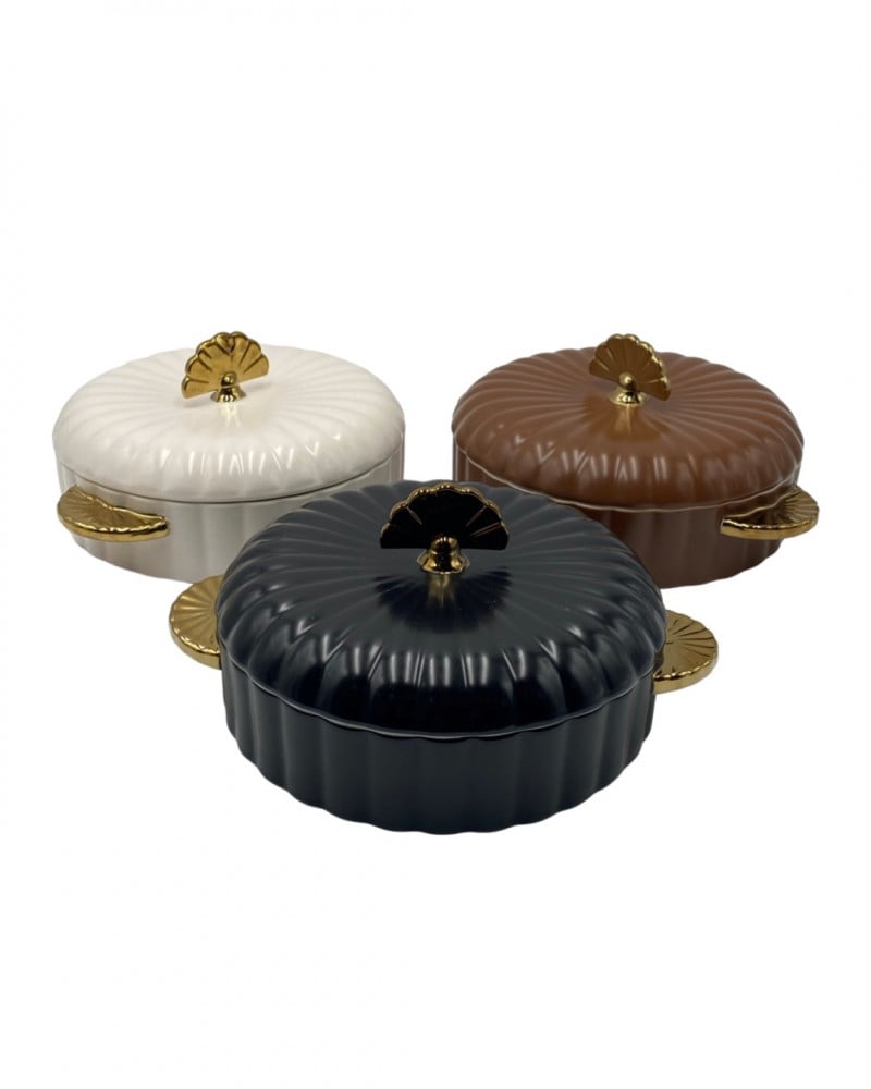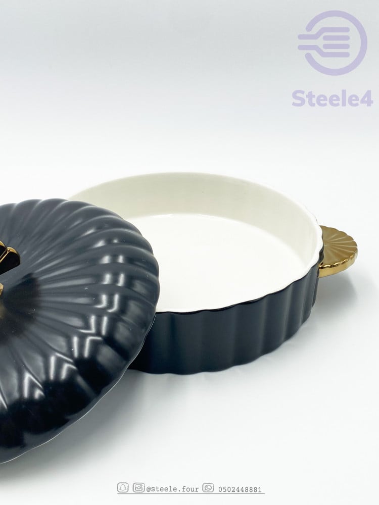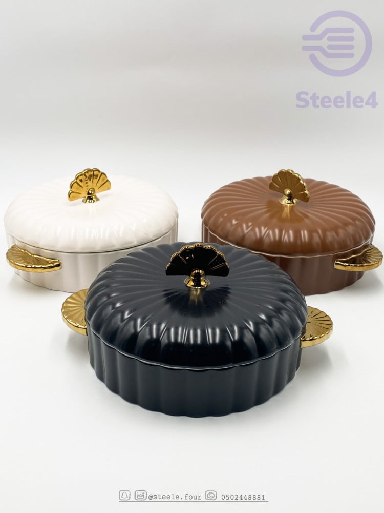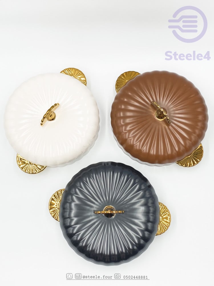 وعاء مصنوع من مواد عالية الجودة بألوان متعددة ملفته ، ذو مقابض ذهبية براقة تزيد من جمالها ، اختيار مناسب لمائدتك الانيقة