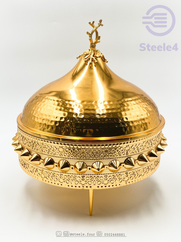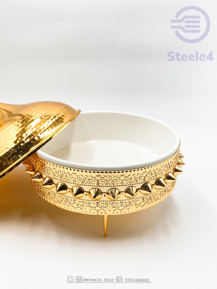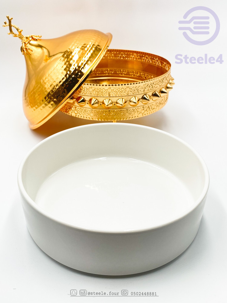 سخان تقديم دائري مكون من مزيج رائع يجمع السراميك و المعدن الذهبي المصنوع بشكل جمالي ملفت له قواعد لحمل السخان..