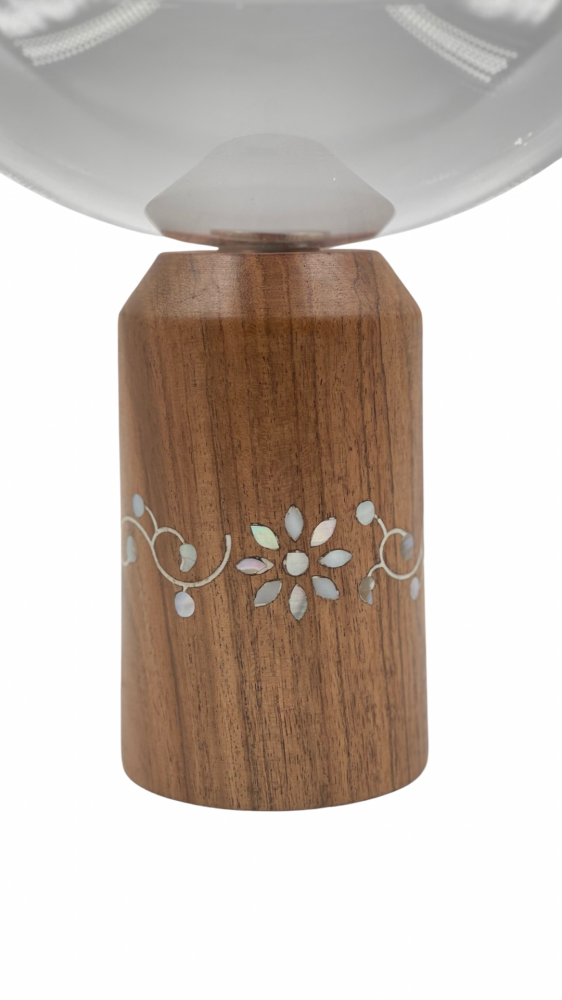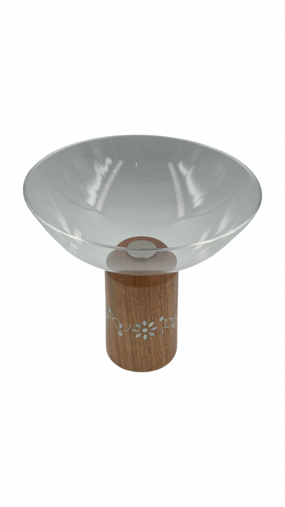 وعاء دائري تقديم شفاف بقاعدة من الخشب الطبيعي مزخرف بالصدف