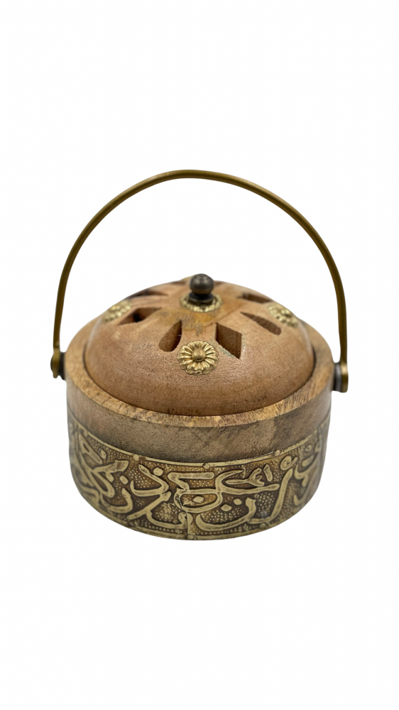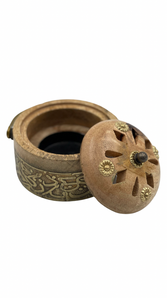 مبخرة دائرية هندية من الخشب الطبيعي بزخرفة حروف عربية بتصميم اندلسي بلون ازرق