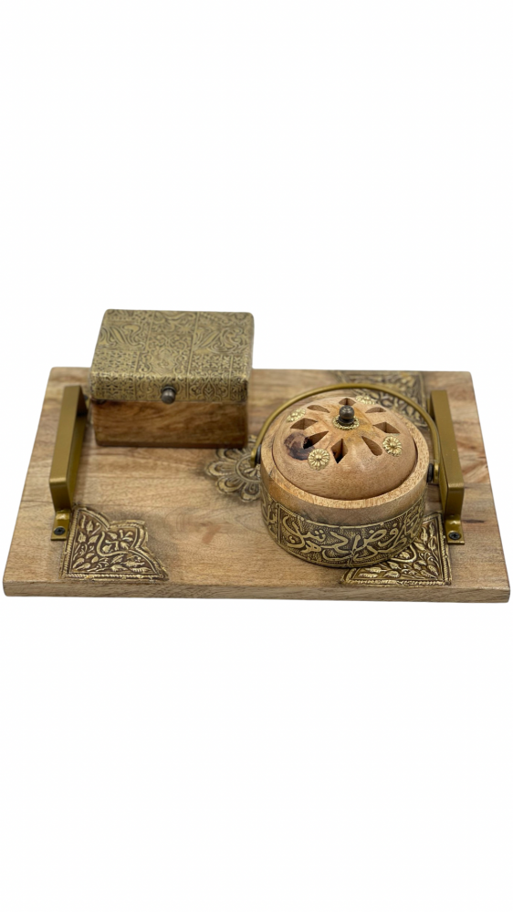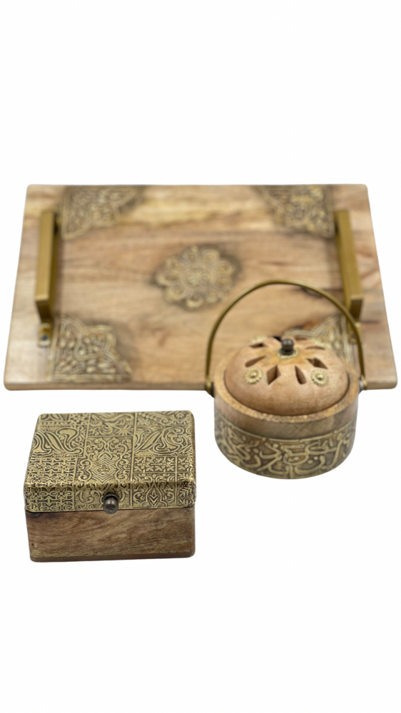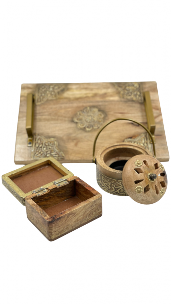 طقم خشبي فاخر من مبخره وصينيه و صندوق بزخرفة جميلة لون بني