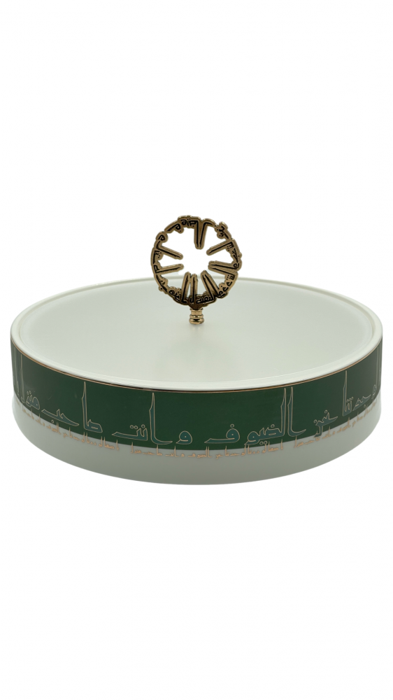 وعاء دائري فاخر من السراميك بغطاء شفاف من الاكرليك. استايل شرقي منقوش بالخط العربي بعبارة وبيت شعر عن الكرم وهي : ياضيفنا لو زرتنا لوجدتنا نحن الضيوف وانت صاحب منزل