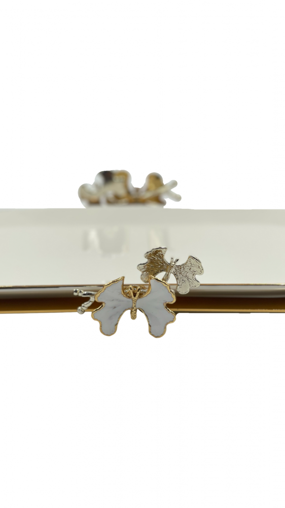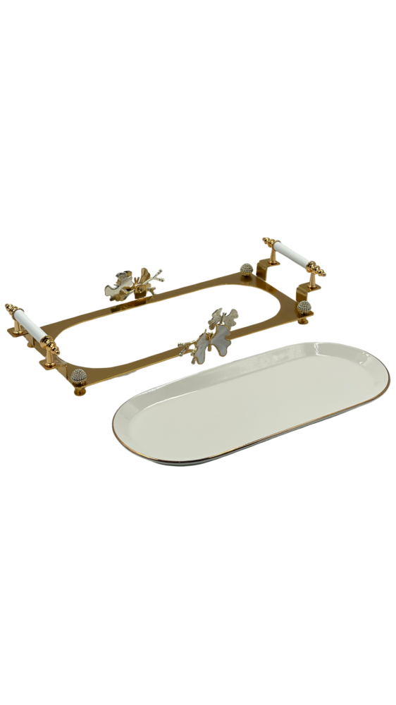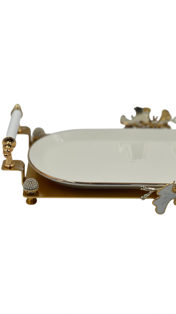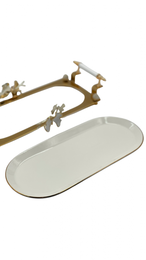 صينية بيضاوية من السيراميك الابيض بقاعدة ذهبية مفصولة استايل الفراشة