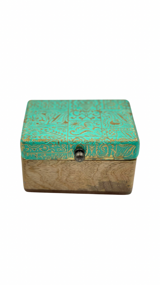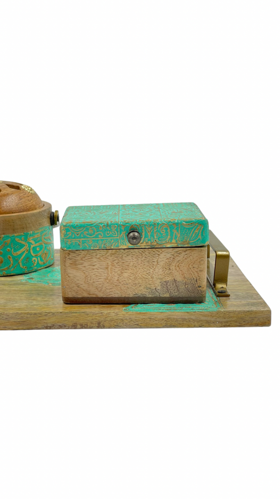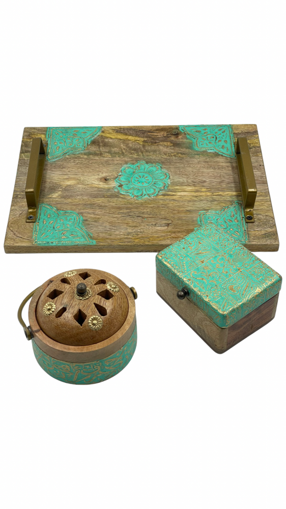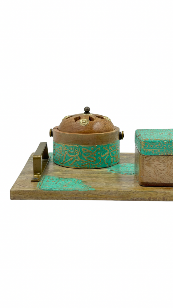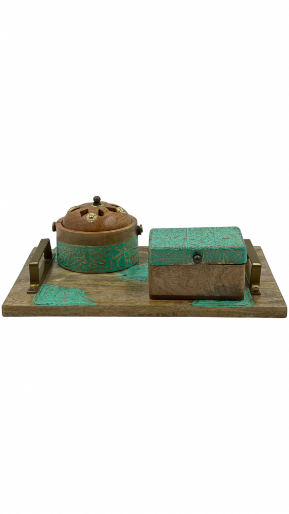 طقم خشبي فاخر من مبخره وصينيه و صندوق بزخرفة جميلة لون اخضر