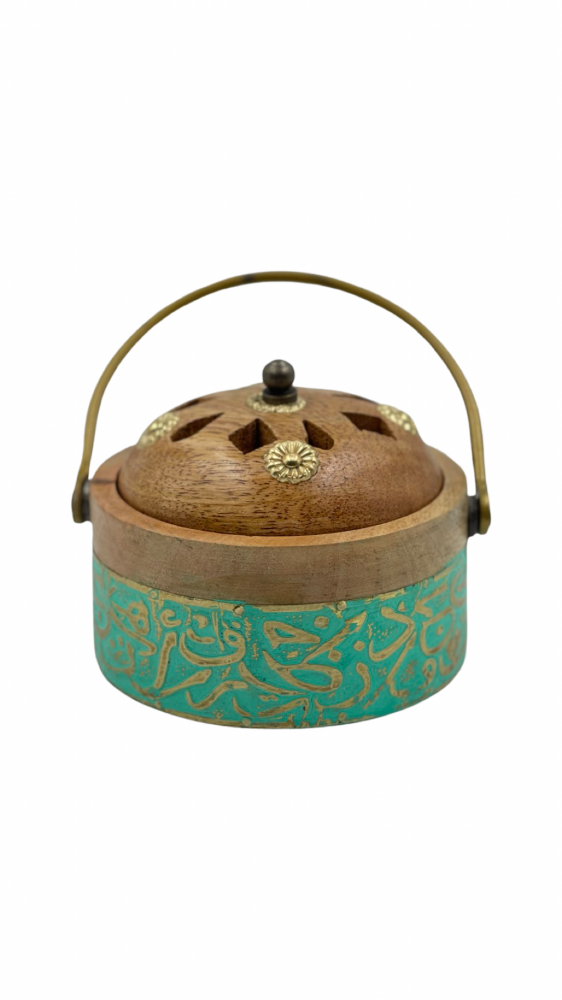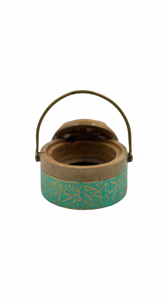 وعاء دائري الشكل مصنوع من الخشب و النحاس مزيّن بنقوش الاحرف العربية مطليه باللون الذهبي .بحجمين مختلفين