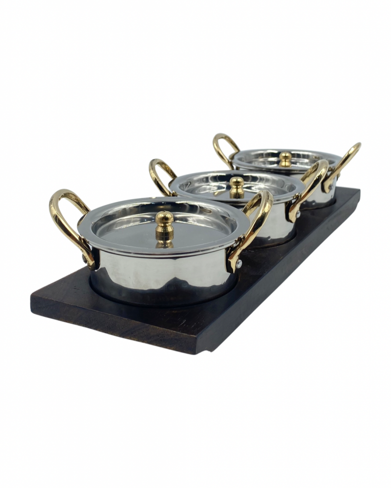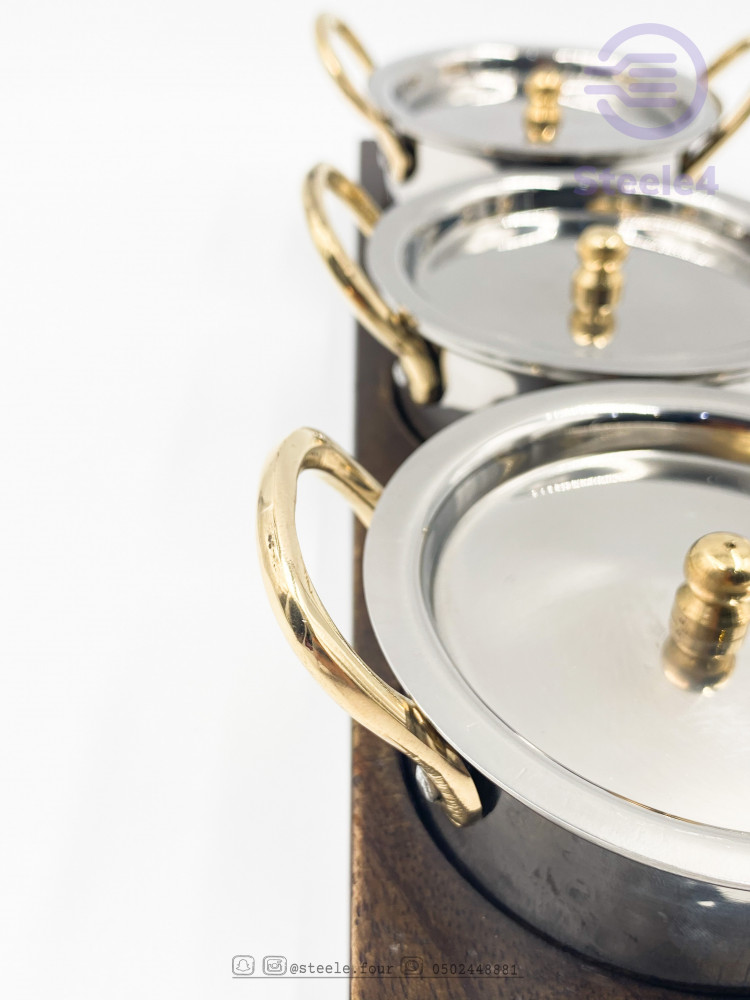 طقم من ثلاث اوعيه من النحاس بغطاء على صينية ديكور خشبية جميله تضفي لها شكلاً مميزاً وفريد من نوعه .