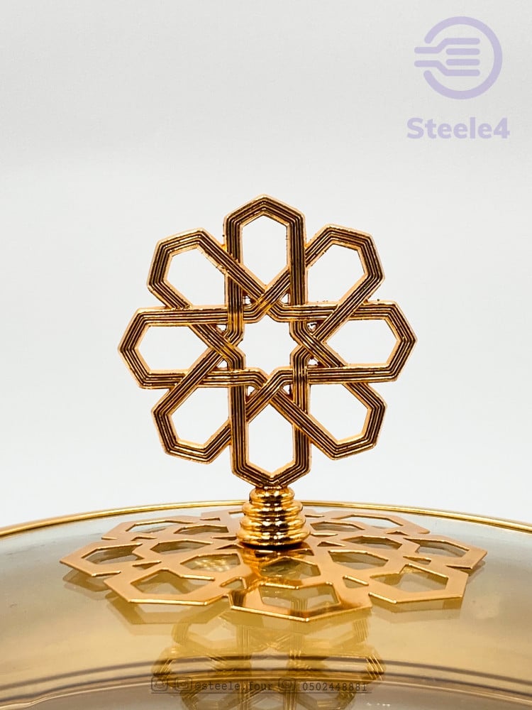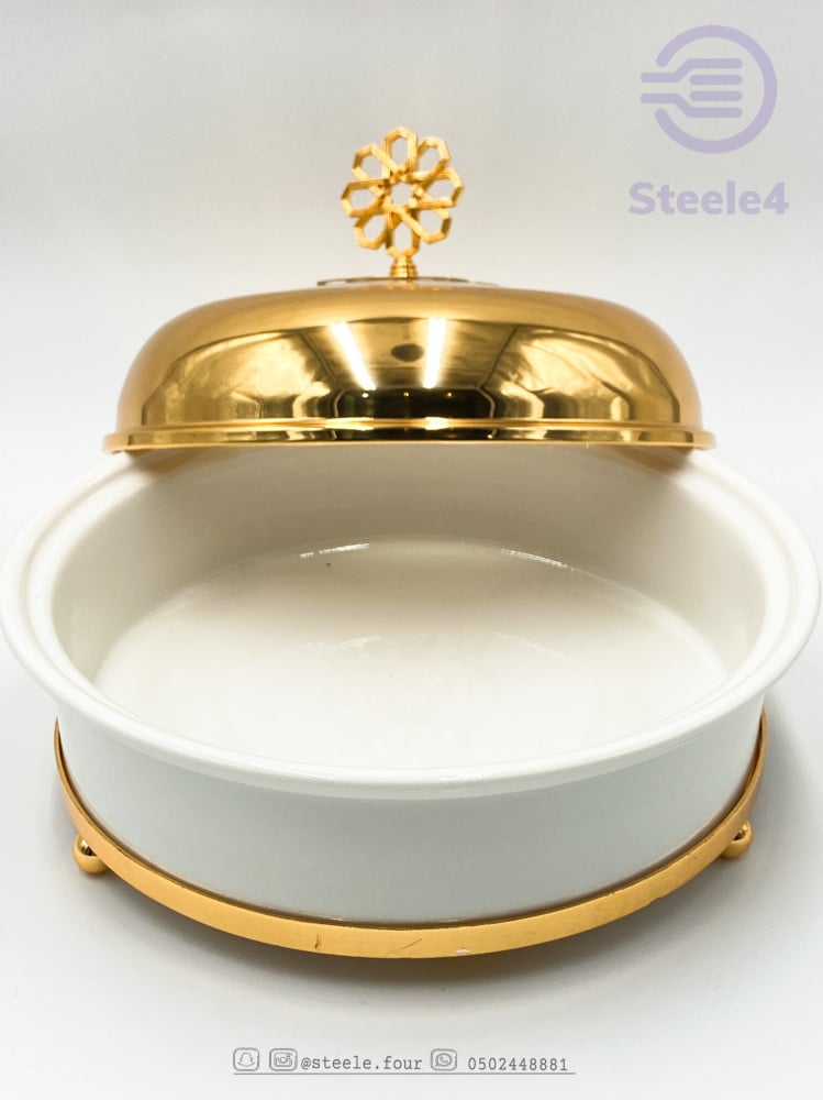إناء من السيراميك الابيض المحاط بقاعدة معدنيه ذهبيه واقدام انيقه تضفي لها ارتفاع بسيط جذاب ، بغطاء مدبب ذهبي ومقبض بالنقوش الاسلاميه المميزه ..