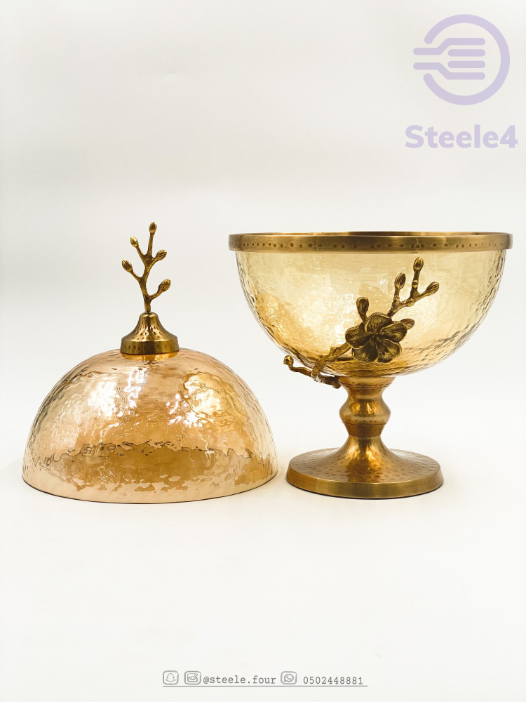 وعاء دائري الشكل مصنوع من الخشب و النحاس مزيّن بنقوش الاحرف العربية مطليه باللون الذهبي .بحجمين مختلفين