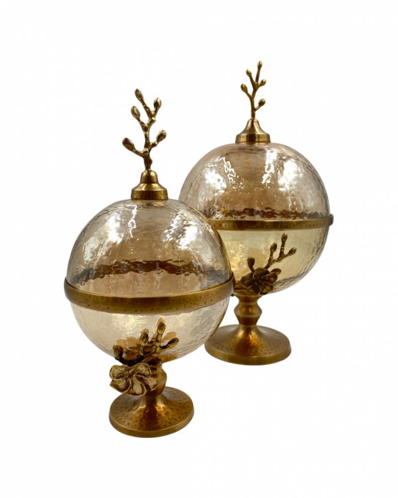 تحفه كرويه مبتكره من الزجاج بتشطيب ذهبي لامع ومزينه بأغصان وزهور نحاسيه ذات نمط فاخر