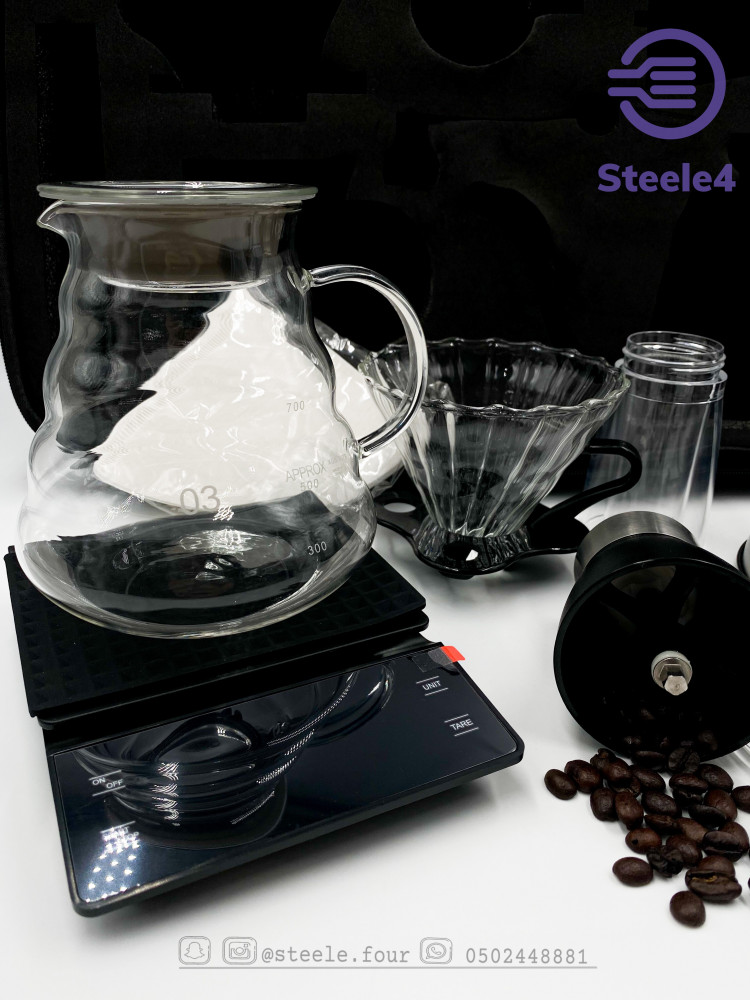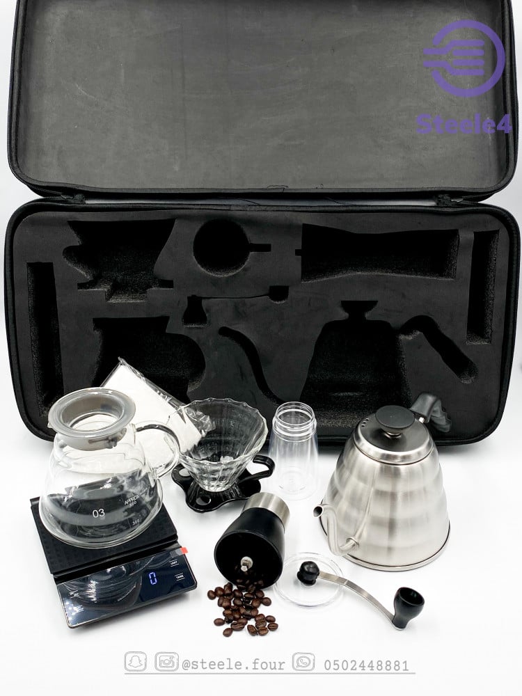 شنطه قهوة مختصه تحتوي على ابريق تقطير و فلتر و قمع ترشيح v60 و طاحونه و ميزان و كوب
