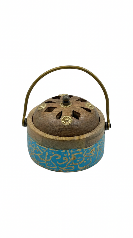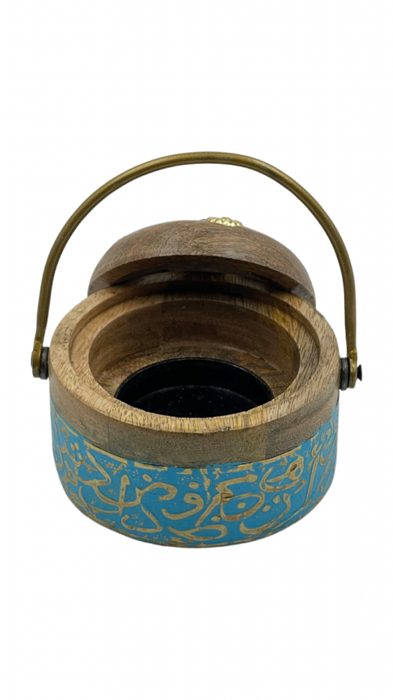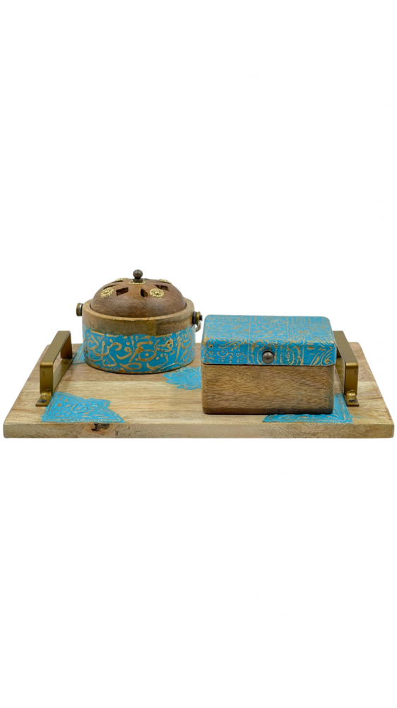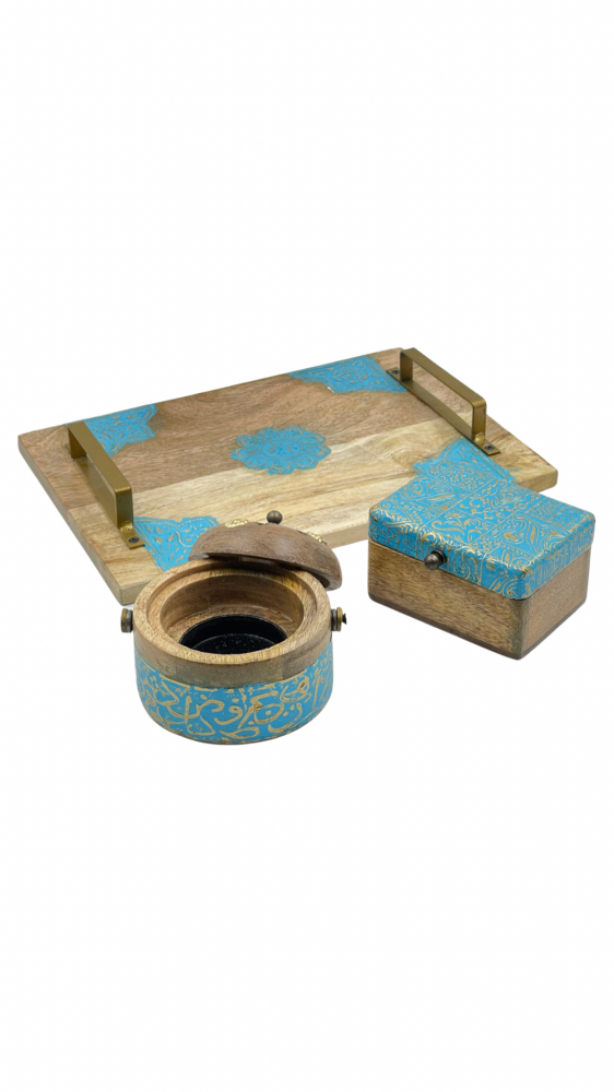 طقم خشبي فاخر من مبخره وصينيه و صندوق بنقش ذهبي جميلة لون ازرق