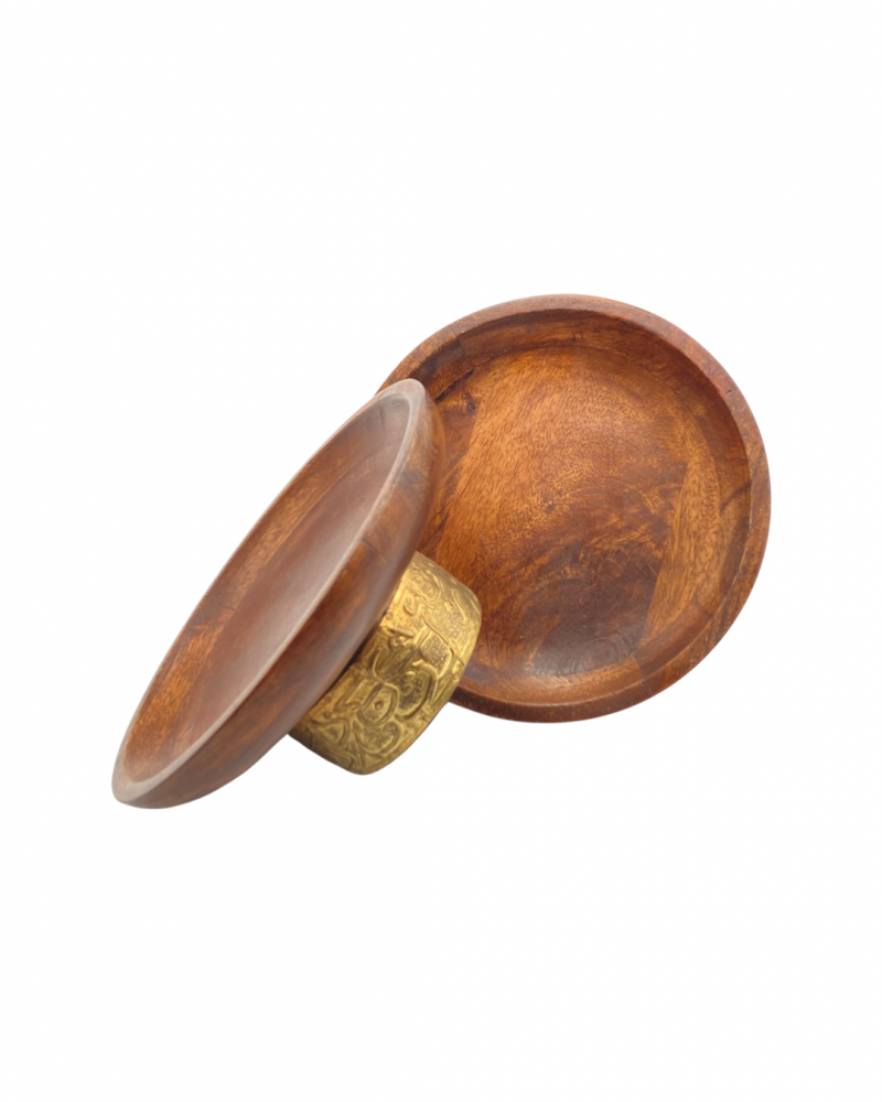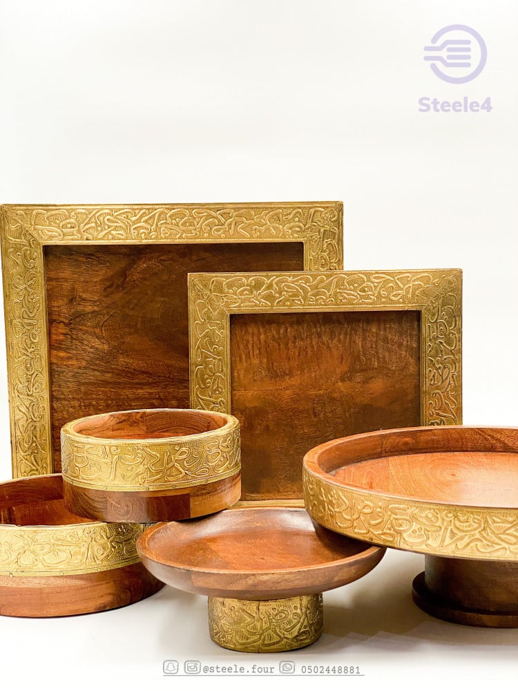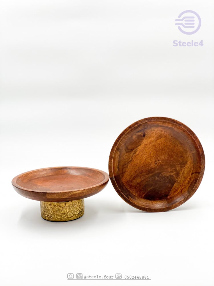 طبق تقديم دائري ذو قاعدة يزينها شريط نحاسي بنقوش الاحرف العربية باللون الذهبي ضمن مجموعة الخشب الذهبي