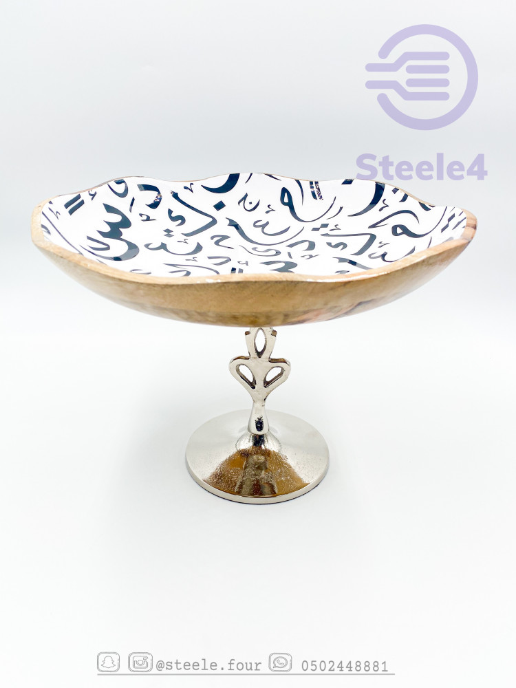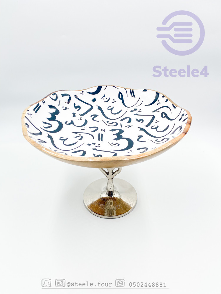 وعاء دائري ومجوف من الخشب عالي الجوده مبطن باللون الابيض مزخرف بنقوش الاحرف العربيه ,مطلي بماده امنه للطعام وسهل التنظيف , يتميز بقاعده فضيه رائعه