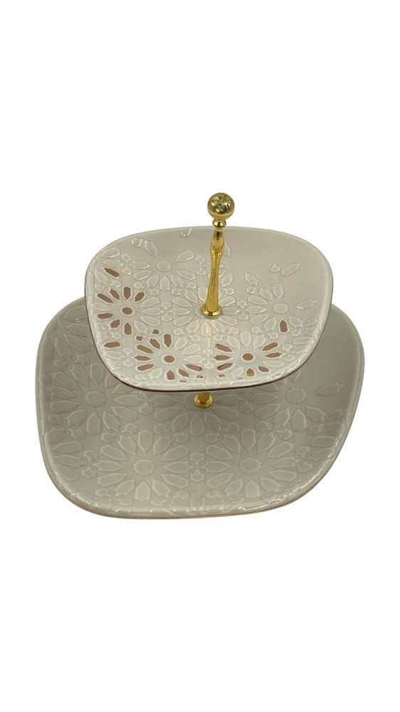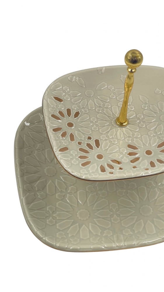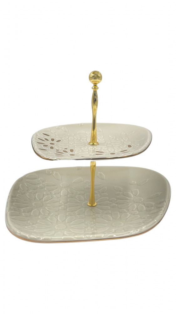 ستاند طبقين كبير وفاخر من السيراميك الابيض بقاعدة ذهبية مفصولة استايل الفراشة