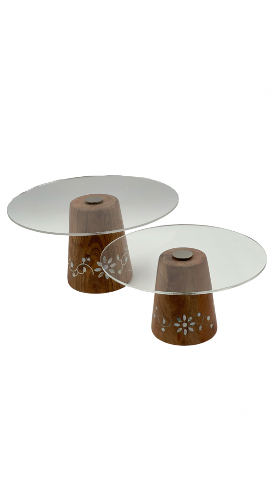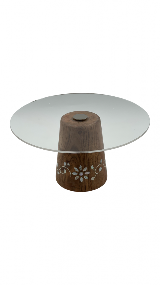ستاند شفاف بقاعدة من الخشب الطبيعي مزخرف بالصدف