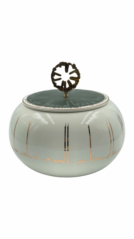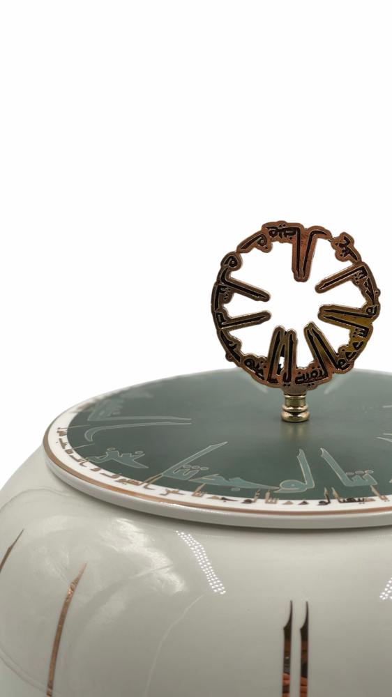 وعاء دائري مقعر فاخر من السراميك بغطاء سراميك ينفع ان يكون فيه شوربه او مكرونه او حتى اكلات شعبية ومناسب في سفرة افطار رمضان المبارك . استايل شرقي منقوش بالخط العربي بعبارة وبيت شعر عن الكرم وهي : ياضيفنا لو زرتنا لوجدتنا نحن الضيوف وانت صاحب منزل