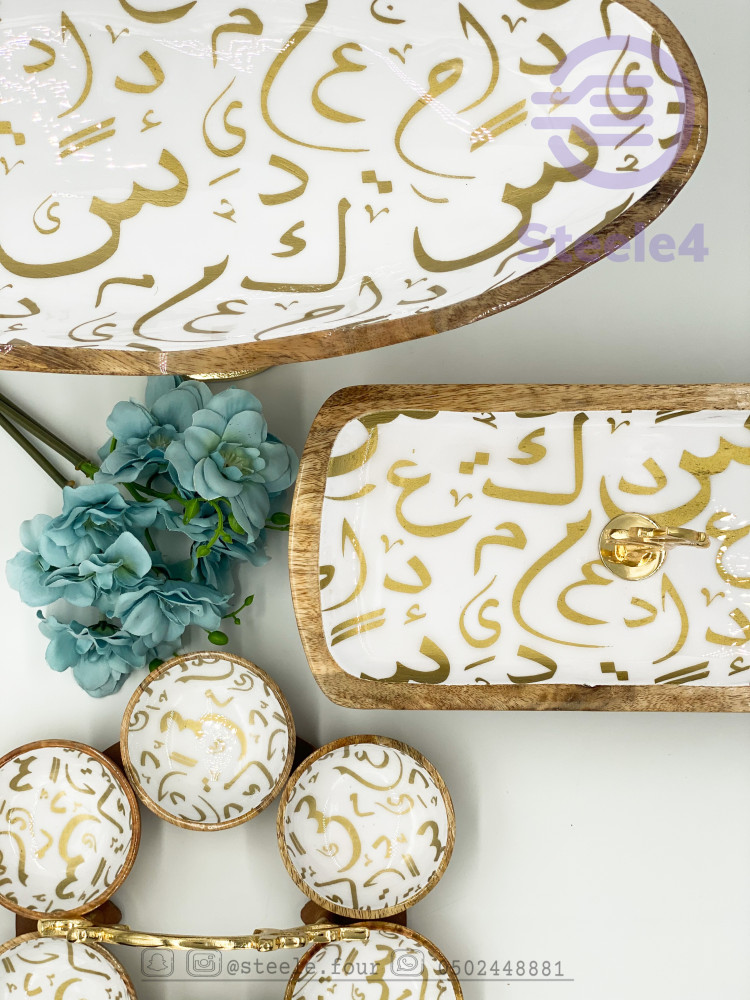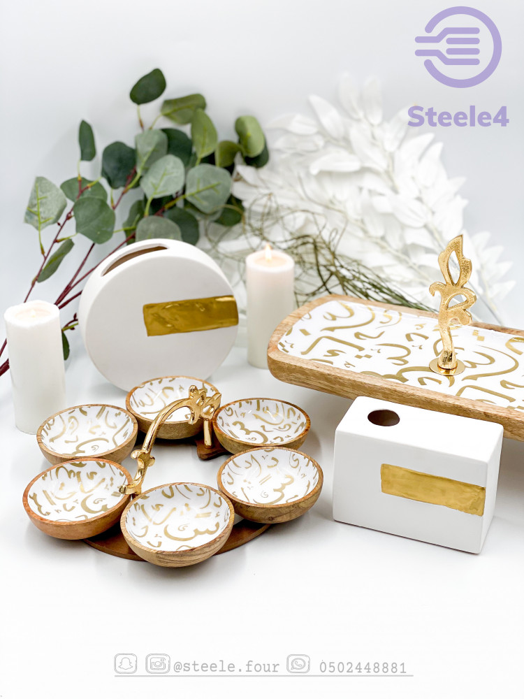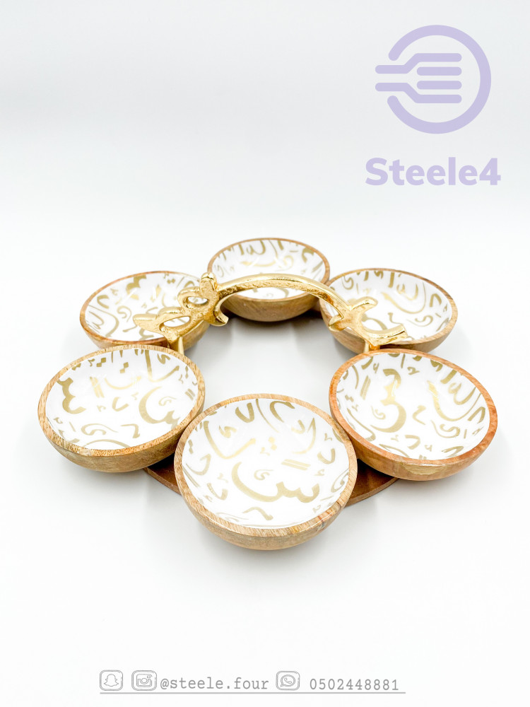 وعاء تقديم مكون من 6 اوعيه صغيره فاخر بتصميم عصري , له حامل ذهبي مميز بغصن وورد ,مطلي بماده امنه للطعام وسهل التنظيف
