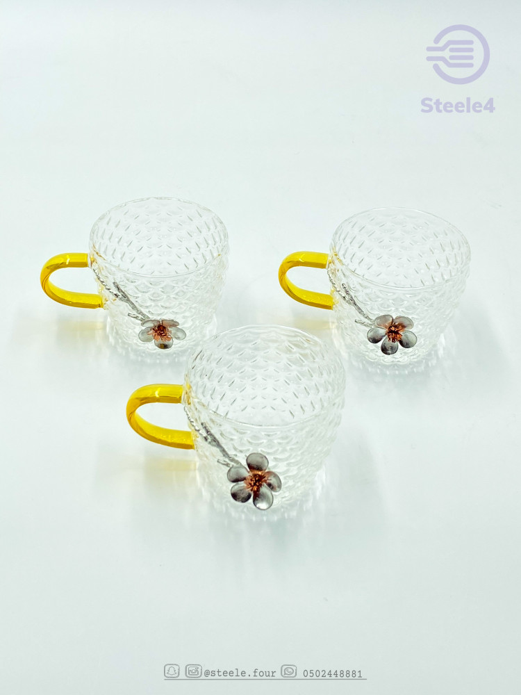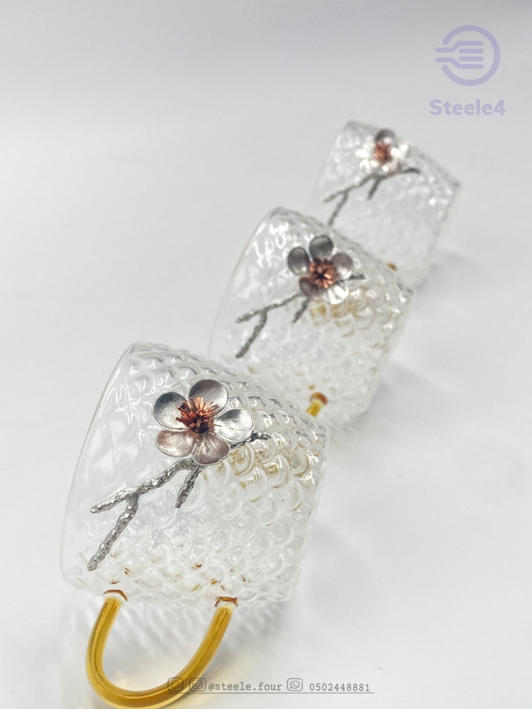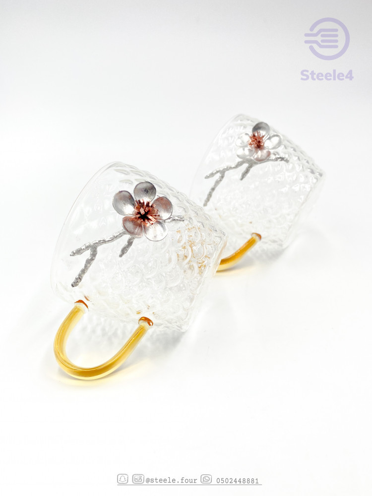6 اكواب شاي لعشاق التميز بتصميم عصري فريد من نوعه ذو جودة عالية مقاوم للحراره هذه المجموعه المكونة من 6 فناجيل شاي شفافة مزخرفة بزهرة البرقوق ذات مقبض ذهبي جذاب ، سعة الكوب : 120 ml