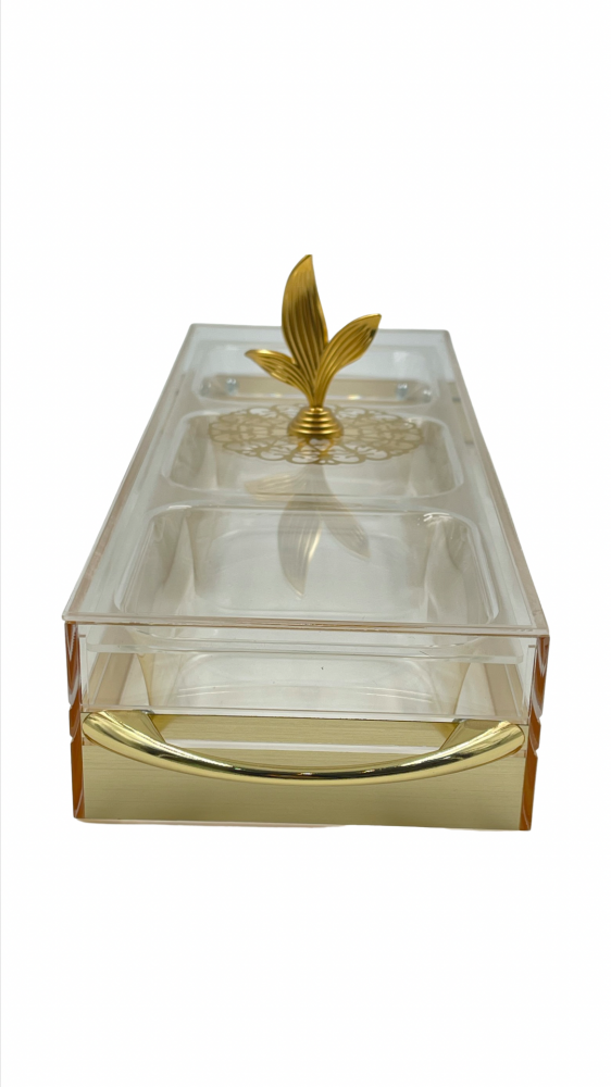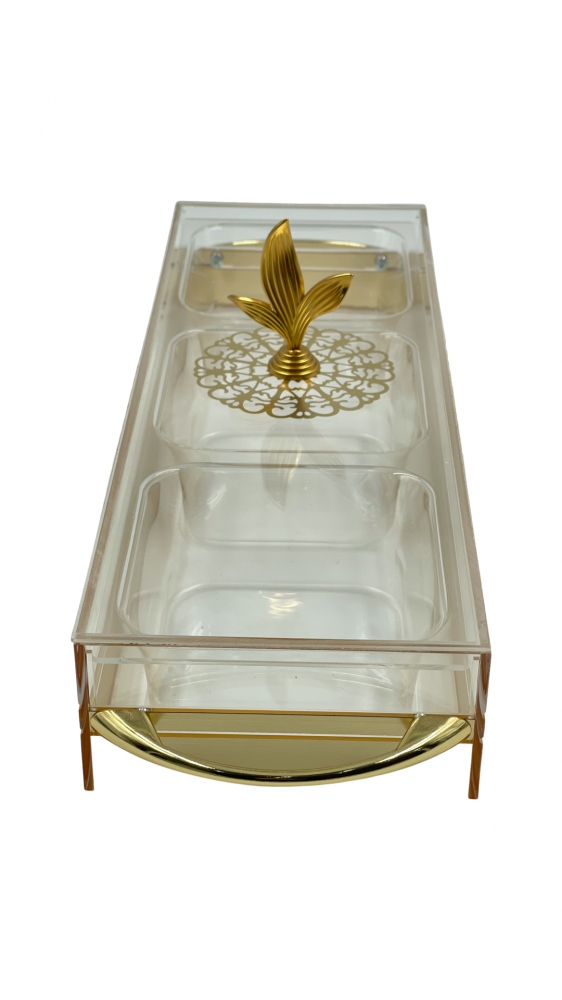 زيني ضيافتك وسفرتك المفضلة بهذه الصينية الرائعة بلمسات ذهبية انيقة المقسمة الى ثلاثة اقسام مع قواعد لرفعه قليلا بمقبض ذهبي مميز. مصممة باستايل مستطيل عصري، وبقاعدة متباينة تعزز من شكلها، مصنوعة من الأكريليك المتين، وتعكس رقي و روعة ذائقتك و اختياراتك.